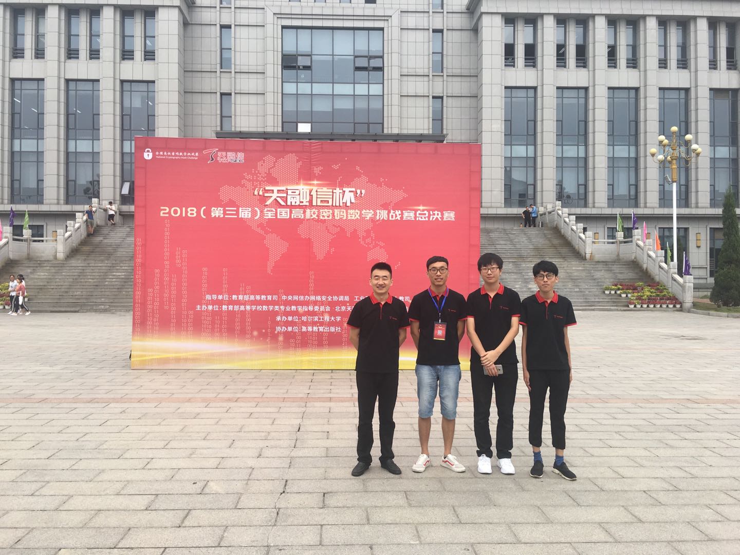 8月8日,第三届“天融信杯”全国高校密码数学挑战赛总决赛在哈尔滨工程大学落幕,田呈亮博士指导的团队(由2016级信息安全专业本科生车珺、邱树浩及2017级研究生周强组成)获全国二等奖。