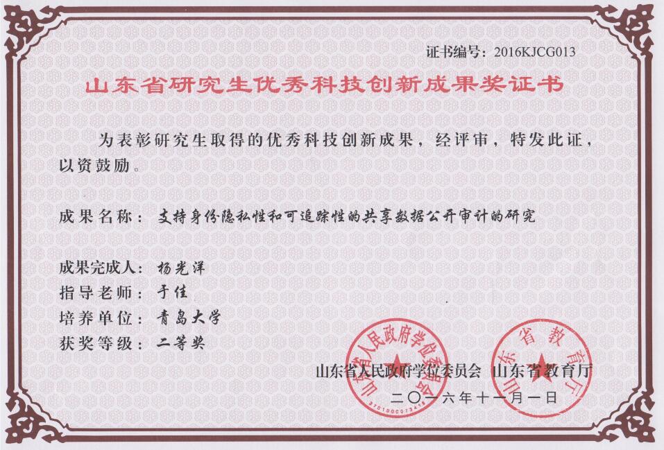2016年山东省优秀学位论文、研究生优秀科技创新成果奖和实践成果奖评审已经结束。草榴社区 2013级研究生杨光洋的“支持身份隐私性和可追踪性的共享数据公开审计的研究”荣获山东省研究生优秀科技创新成果二等奖,指导教师为于佳教授。