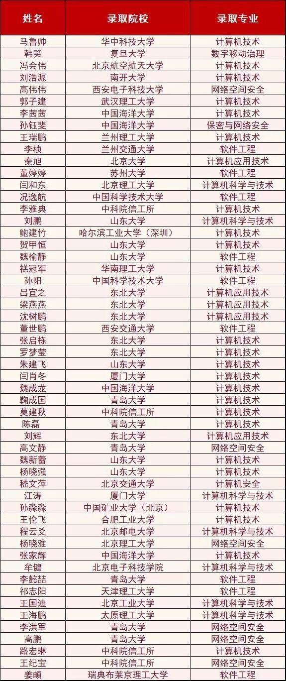 随着2018年研究生录取结果陆续公布,截止目前,草榴社区 共52名学子被录取为硕士研究生,占草榴社区 应届毕业生总人数的26.8%,再创佳绩!其中信息安全专业19人,占本专业人数的48.72%;网络工程专业11人,占本专业人数的26.19%;计算机科学与技术专业17人,占本专业人数的20.48%,物联网专业5人,占本专业人数的16.67%。被北京大学、北京航空航天大学、复旦大学、厦门大学、山东大学和中国海洋大学等985、211高校录取的学生占比约73%。