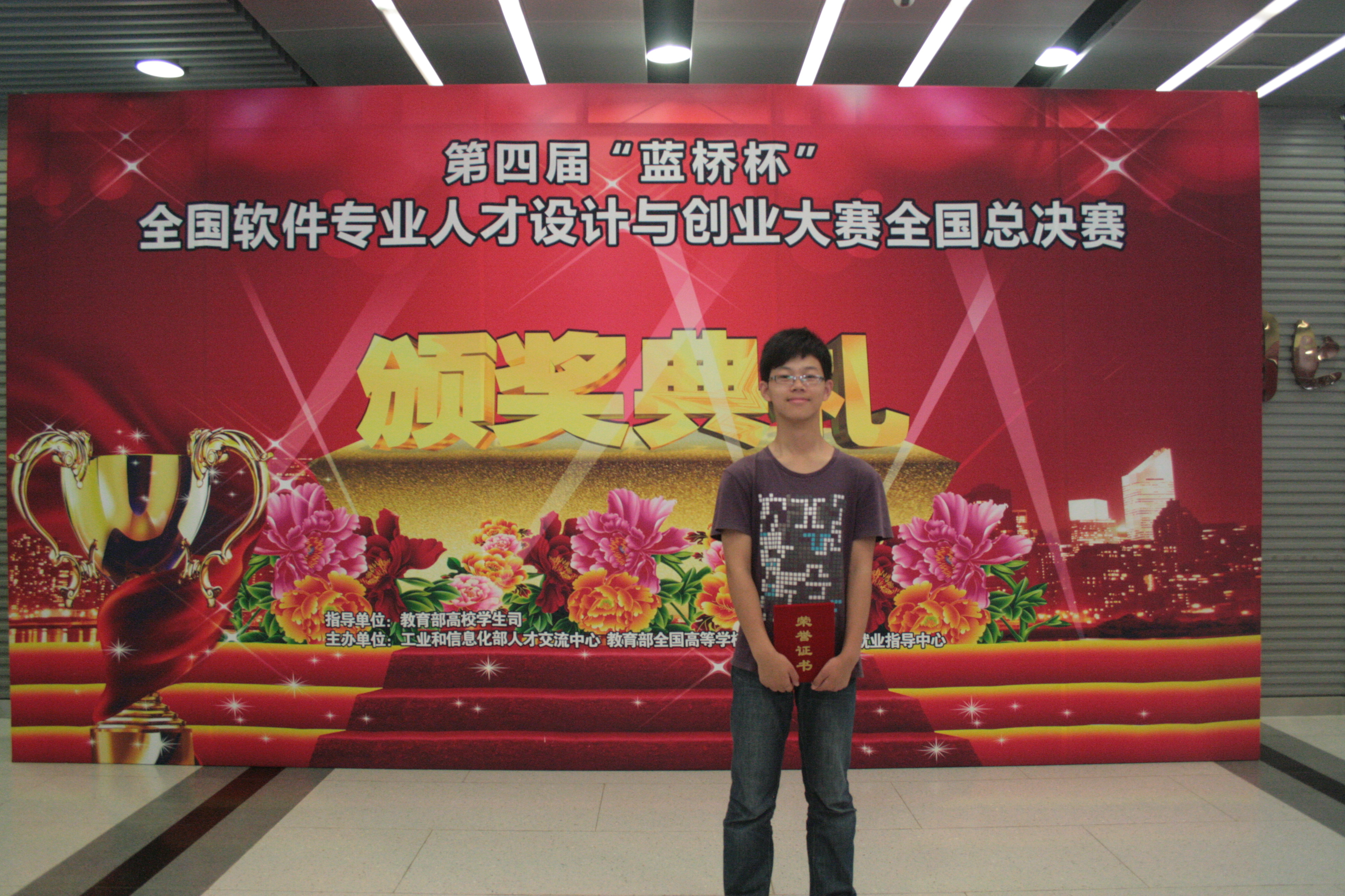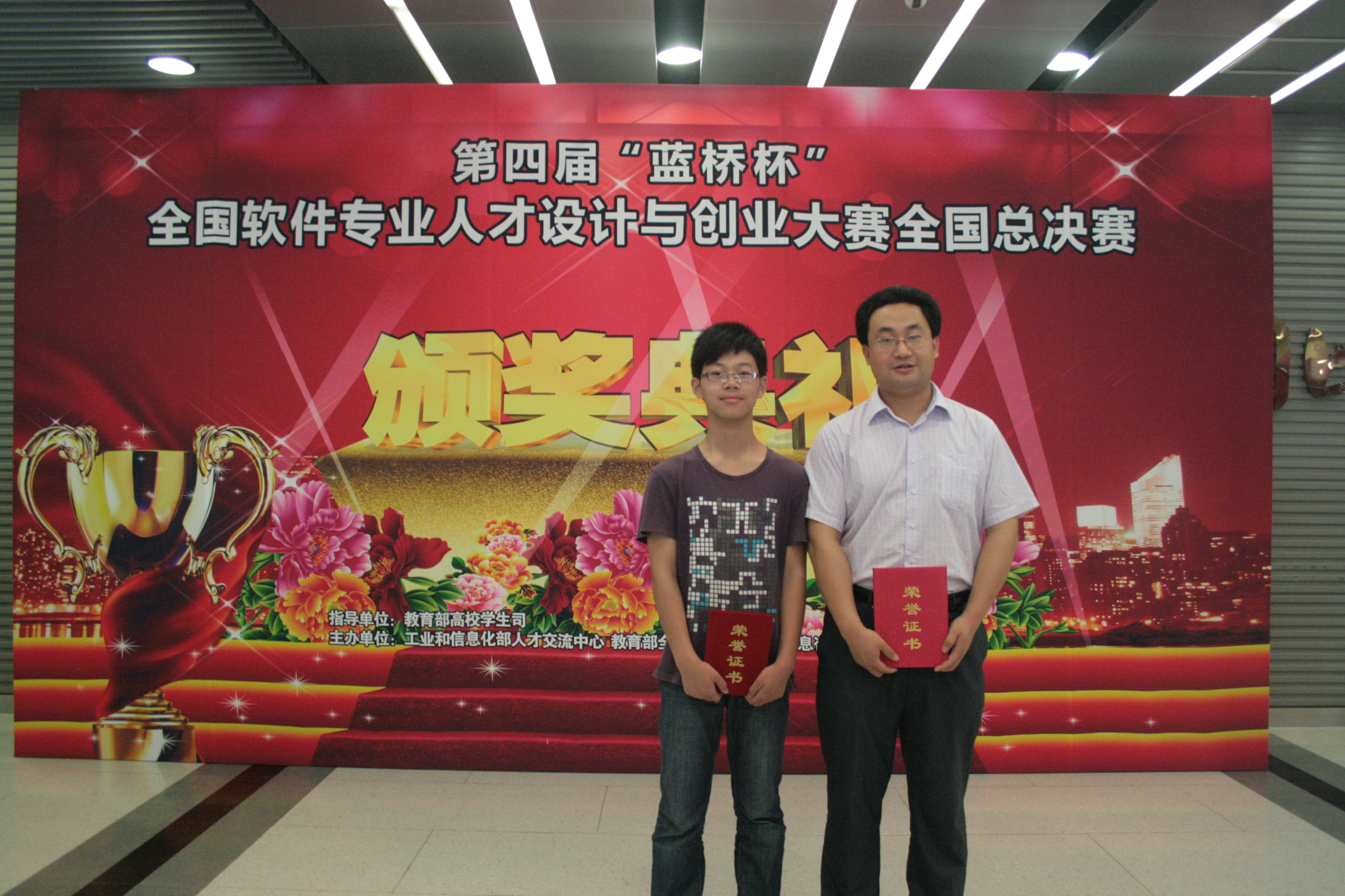 7月13日,第四届“蓝桥杯”全国软件专业人才设计大赛在北京大学体育馆圆满落下帷幕,由草榴社区 李建波副教授指导的邢召龙同学荣获C/C++程序设计B组总决赛全国一等奖,我校荣获“成绩优胜学校”及“优秀组织单位”称号。