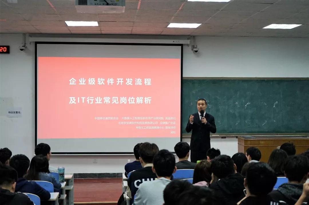 报告会的第一部分为企业级软件开发流程介绍。吴松首先以企业级软件为切入点,向同学们介绍了企业级软件的诸多特点,同时列举出多种企业级软件开发的模型。随后,吴松深入讲解了软件工程开发中软件设计、编码、测试、部署等相关步骤,让在座同学对未来就业后可能涉及的企业级软件开发流程有了清楚的认识。