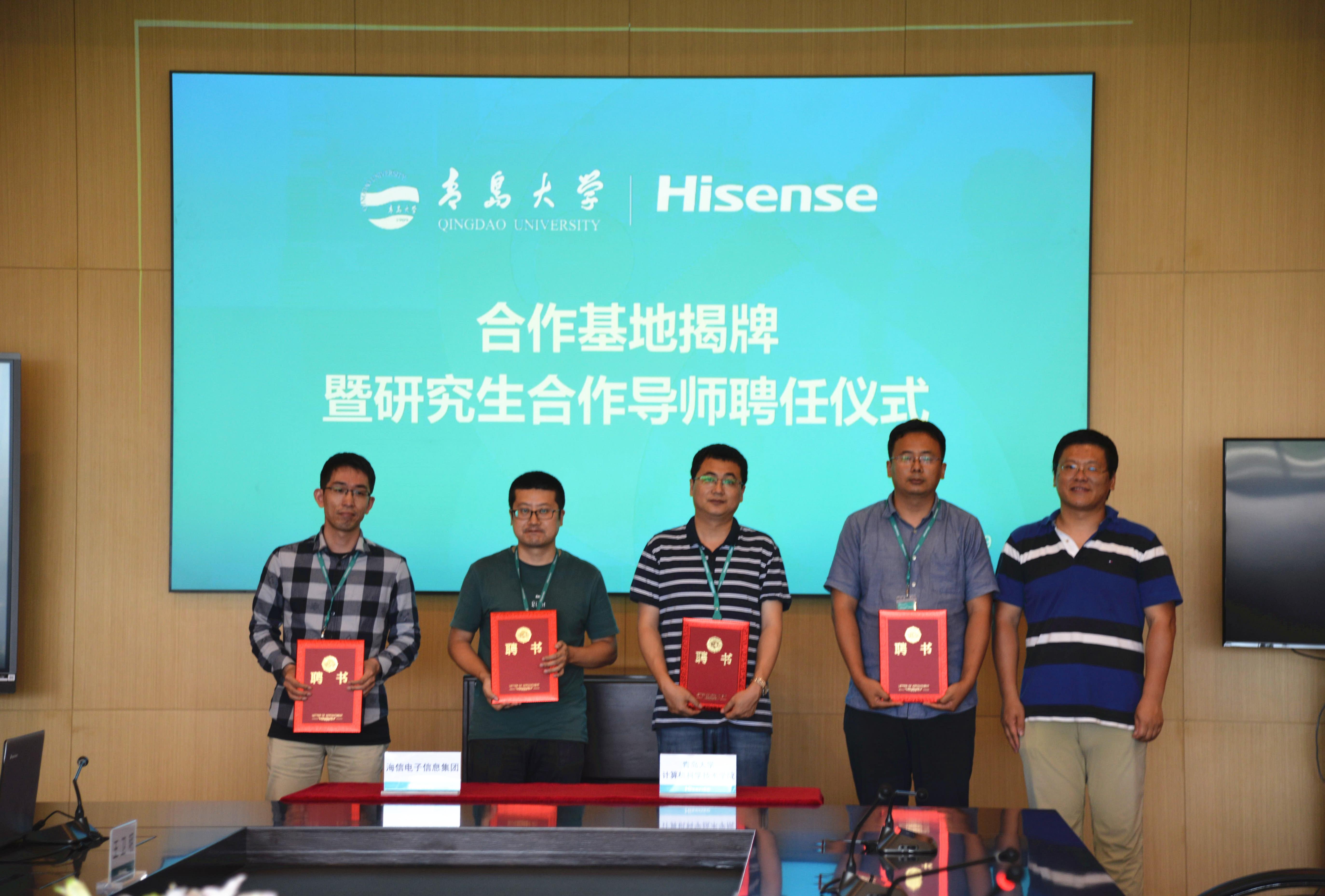 马小航、尹增刚,张龙吉、于佳,TOD、王国栋分别为“研究生创新与联合培养基地”“海信集团人才培训基地”“草榴社区 实习与就业基地”揭牌。周鹏、于佳为8位海信电子信息集团研究生合作导师颁发聘书。