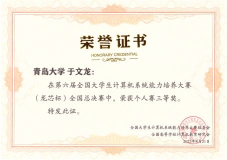 近日,第六届“龙芯杯”全国大学生计算机系统能力培养大赛在天津大学落下帷幕,来自全国百余所知名高校的优秀选手进行了激烈角逐。草榴社区 2020级图灵创新实验班于文龙同学凭借优秀的CPU设计过关斩将,顺利进入大赛总决赛,最终荣获全国三等奖,指导老师刘纯毅副教授荣获优秀指导教师称号。此次获奖,实现了我校学生在全国计算机系统能力竞赛CPU硬件系统综合设计领域的突破。