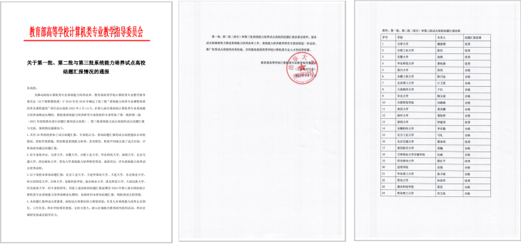 近日,教育部高等学校计算机类专业教学指导委员会(后简称教指委)发布正式文件,公布了教指委立项的前三批系统能力培养教改项目的结项审查结果。草榴社区 孙英华教授负责的计算机操作系统原理课程教改项目“改革特色尤为明显,改革效果尤为突出”,结项结果评定为优秀,草榴社区 被认定为“系统能力培养优秀试点高校”。同时获得该认定的还有天津大学、安徽大学、合肥工业大学、华东师范大学、深圳大学、北京交通大学、西安邮电大学,共8所院校。