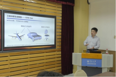 在报告开始时,高林教授简洁地讲解了几何表示的发展,揭示了几何表示从隐式表达到显式表达,现在又回到隐式表达发展的规律。随后,高教授介绍了三维深度生成模型SDM-Net、DSG-Net和高质量纹理生成模型TM-NET。他展示了在2D月壤图像上使用3D重建技术,成功重建出几何精确和纹理真实的月壤模型的工作。