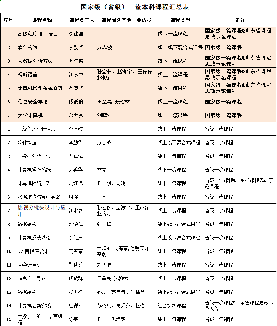 长期以来,学院高度重视本科课程建设,并不断以此为抓手持续推进教学改革,提升人才培养质量。截至2025年8月,学院教师已主持建设7门国家级一流本科课程、15门山东省一流本科课程与6门山东省课程思政示范课程,在山东省属高校同类学院中名列前茅。已建设的课程包括线上、线下、线上线下混合、社会实践四类,覆盖公共基础与专业基础、核心、方向课程,形成了完善的一流课程体系。