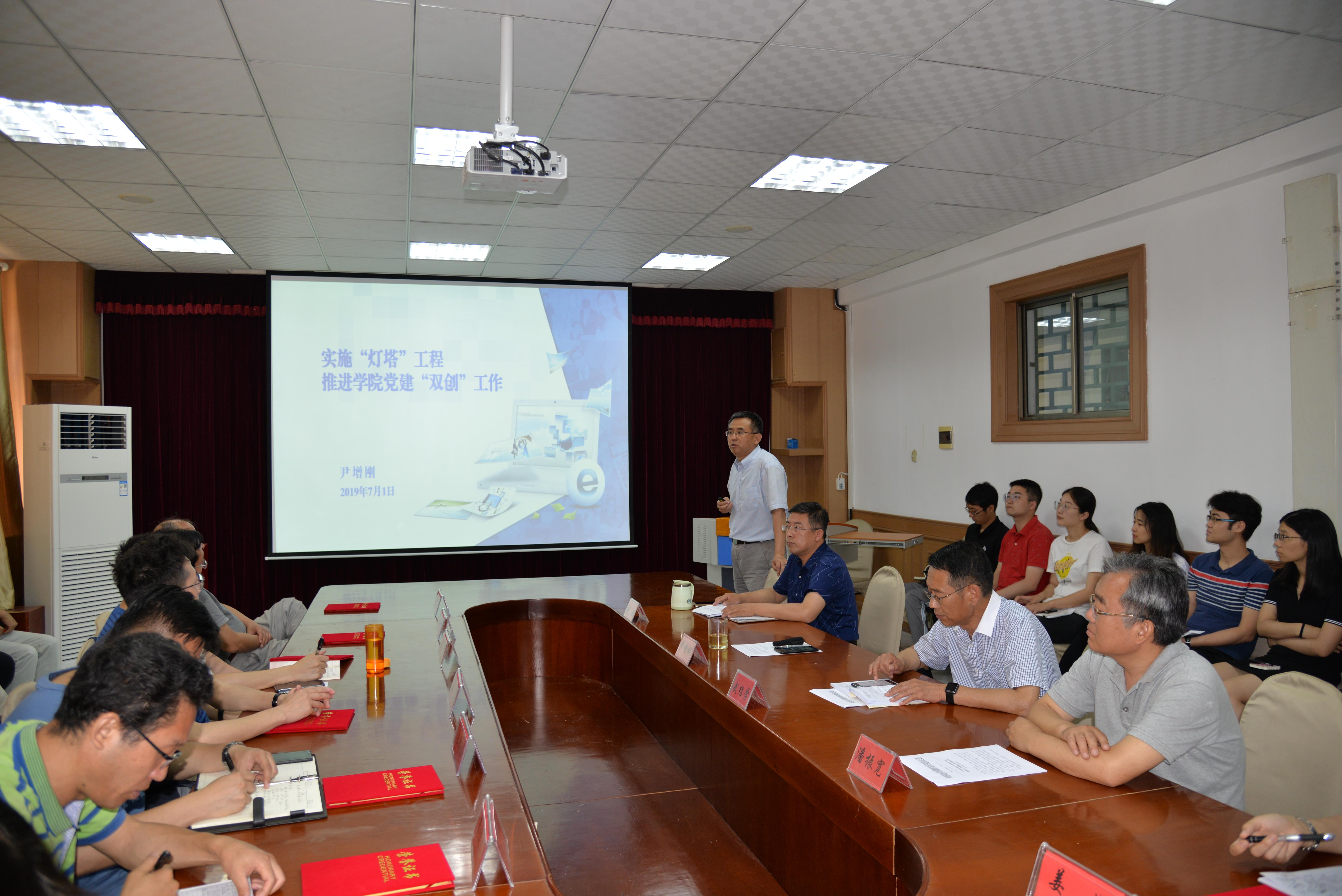 尹增刚做了题为《实施“灯塔”工程,推进学院党建“双创”工作》的专题报告,围绕工作基础、建设计划、预期成果、工作保障等四个方面的内容,向与会党员同志报告了“十三五”以来学院党建工作的主要举措与学院事业发展的标志性成效,分析了目前学院党建工作存在的亟待解决的问题,以“固本强基和凝心聚力工作成效显著、党建品牌建设成效显著、长效机制建设成效显著、改革创新和事业发展成效显著”为目标,提出“加强政治建设,实施‘固本工程’;加强思想建设,实施‘铸魂工程’;加强组织建设,实施‘强基工程’;加强作风建设,实施‘凝心工程’;加强纪律建设,实施‘正心工程’”,对党建工作标杆院系培育创建工作进行了全面部署,同时对2019、2020年的工作目标与工作举措进行了分解。