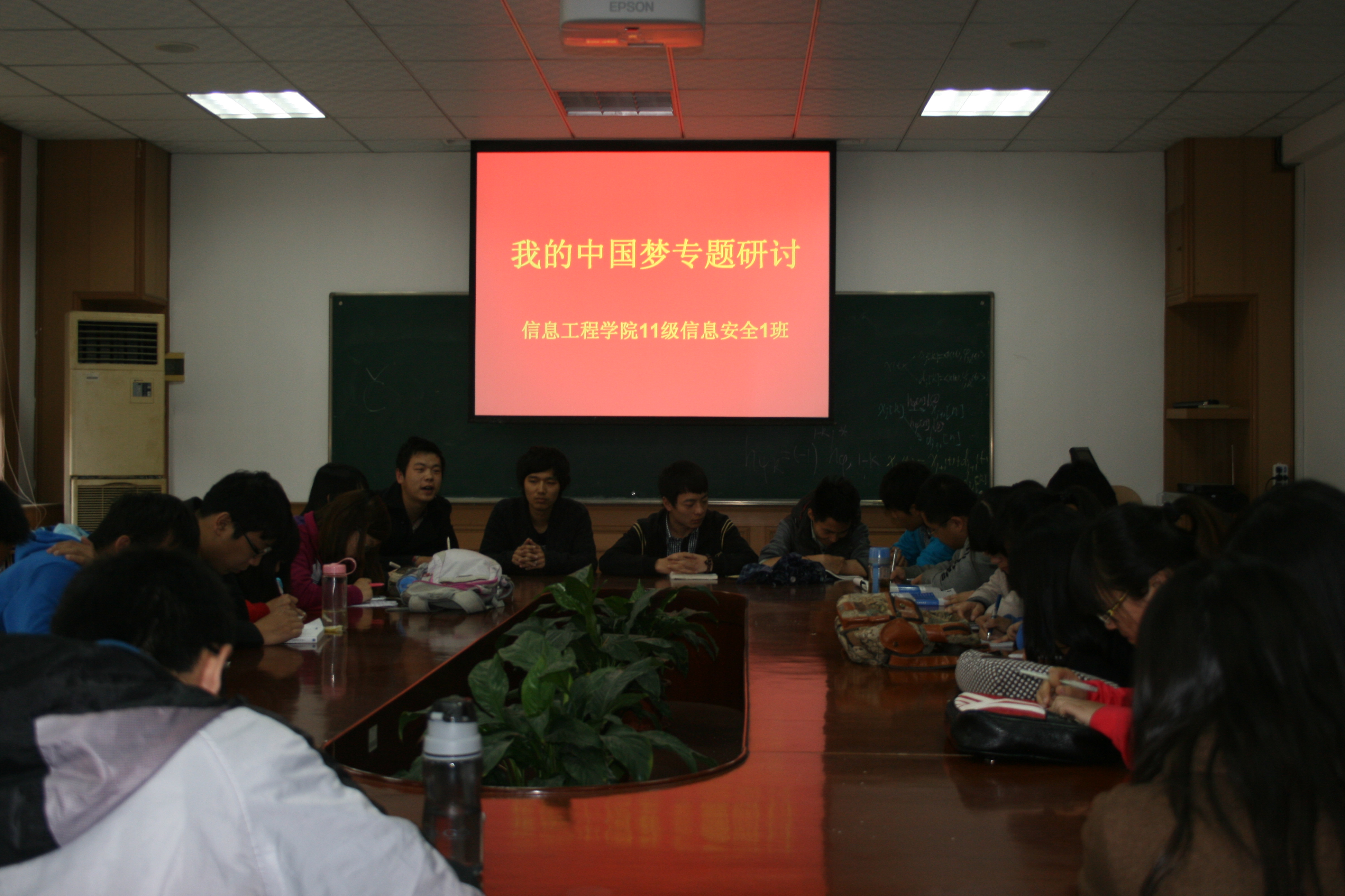 5月3日下午,根据校团委关于组织开展“我的中国梦”线下主题团日活动的要求,草榴社区 2011级信息安全1班全体同学在团总支书记于文洁老师的带领下,围绕“什么是中国梦”、“如何实现中国梦”、“青年学生与中国梦的关系”话题进行互动讨论,同学们积极踊跃参加,分享对“中国梦”的深刻理解。