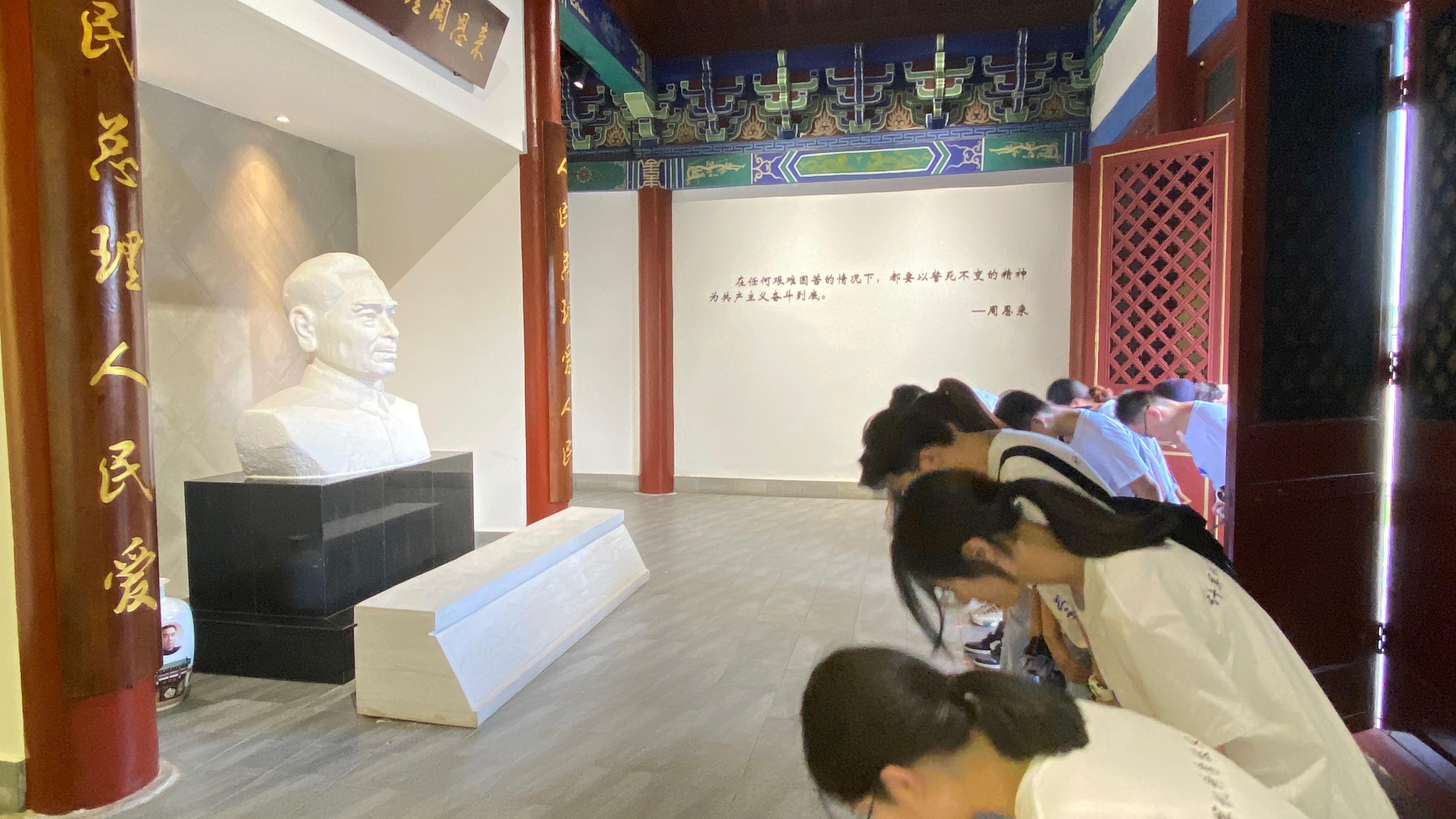 穿过周恩来铜像广场,大家来到怀周祠参观。在感恩殿内,大家向总理雕像鞠躬,进行缅怀仪式,缅怀周总理的丰功伟绩,学习周总理的崇高精神、高尚品格、伟大风范。接下来大家参观了杨柳雪村史馆,感受杨柳雪人当年艰苦奋斗的历史印迹和棉区红旗的辉煌历程,领会“战天斗地、艰苦创业、敢为人先、为民造福”的杨柳雪精神。通过听解说、看视频等多种方式,服务团的同学们深刻地认识到“不忘初心、牢记使命”的责任感和使命感,表示一定会在接下来的社会实践活动中克难奋进、创先争优。