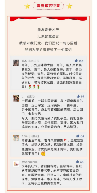 为激发青春才华,汇聚智慧语言,引导青年深刻感悟新时代党和国家事业发展的伟大成就,述说自己的青春感悟,4月26日——5月4日,草榴社区 全体师生参加了“青春感言”征集活动。为青春留下一句寄语,对我们党、我们团说一句心里话:“青春生生不息,奋斗未有穷期”“少年负壮气、奋烈自有时”“因为我们流着的热血,心里燃着的火,从未熄灭”……一句句铿锵有力的语句展示了学院师生们激扬奋发的精神面貌和努力成长为堪当民族复兴重任的时代新人的心理愿景。