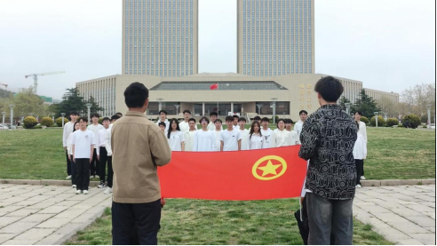 优秀团员代表苏玉箫带领新团员进行入团宣誓。新团员面向团旗,举起右拳,庄严宣誓。