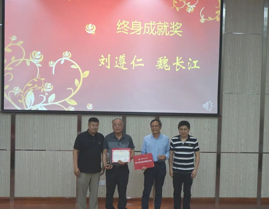 崔洪军、李磊,胡志秋、龚超、刘伟、宋奕红六位校友分别为“教学能手奖”获得者郑世秀老师、隋毅老师、张培俭老师、王卓老师,“教研能手奖”获得者张志梅老师、苗盛老师、杜祥军老师、孙仁诚老师,“终身成就奖”获得者刘遵仁、魏长江老师颁发奖状。