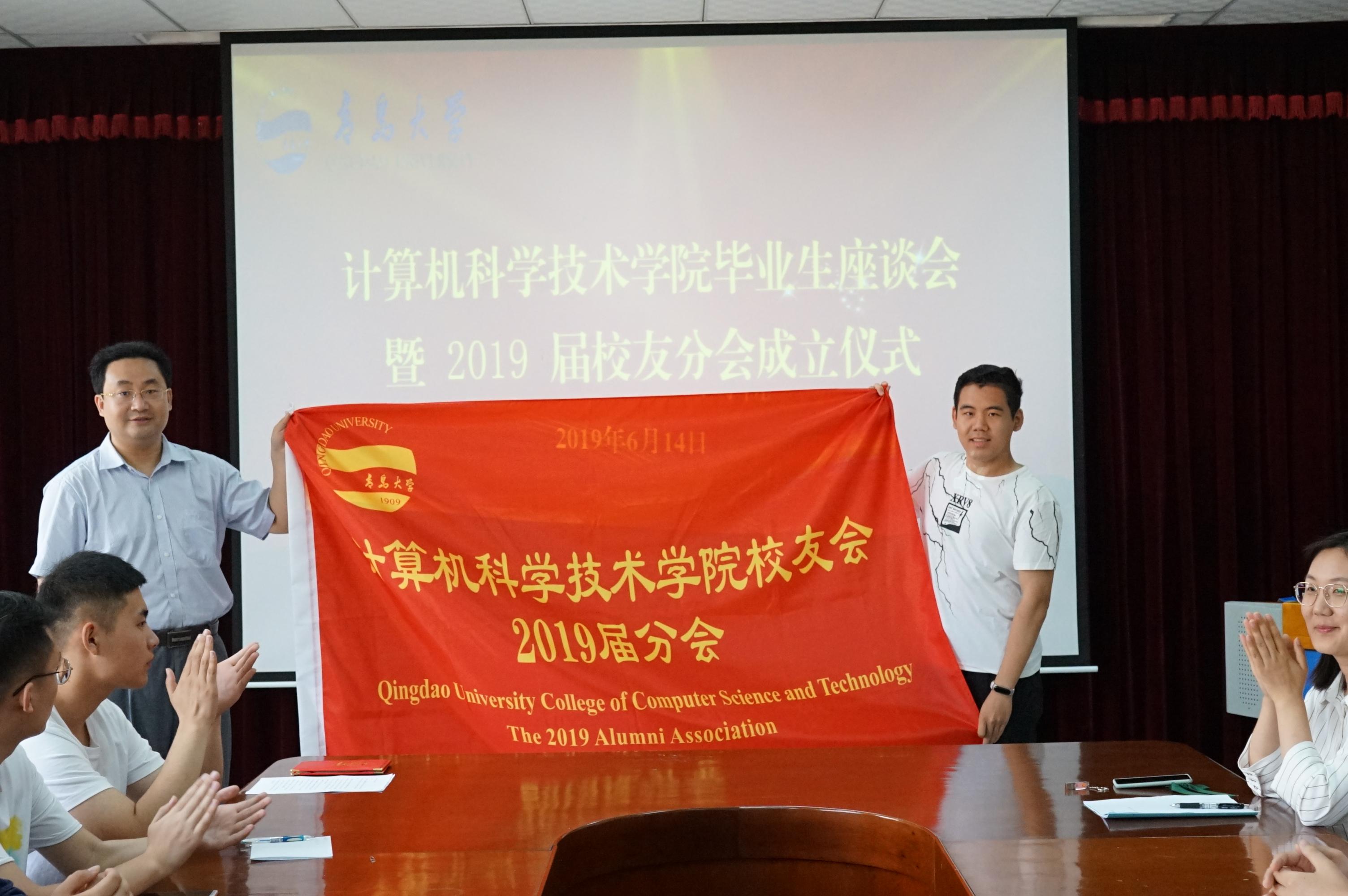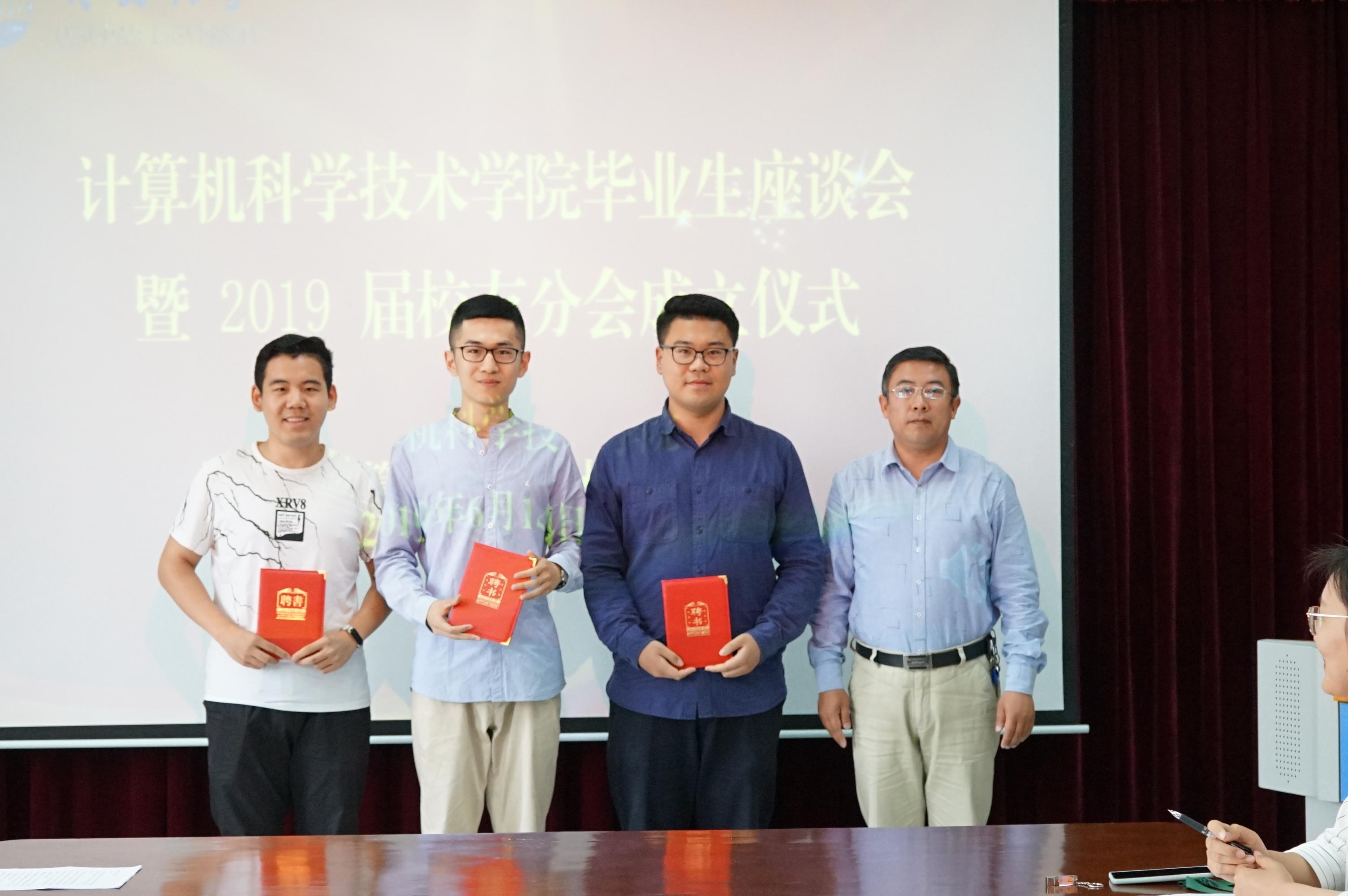 会上举行了学院校友会2019届校友分会成立仪式,李建波向2019届校友分会授旗。周鹏向2019届校友分会会长齐永孟,副会长陈泉江、吴岱玮颁发聘书。于茜宣读了2019届校友分会机构和成员名单。2019届校友分会会长齐永孟发言,并代表全体毕业生宣读了文明离校倡议书。